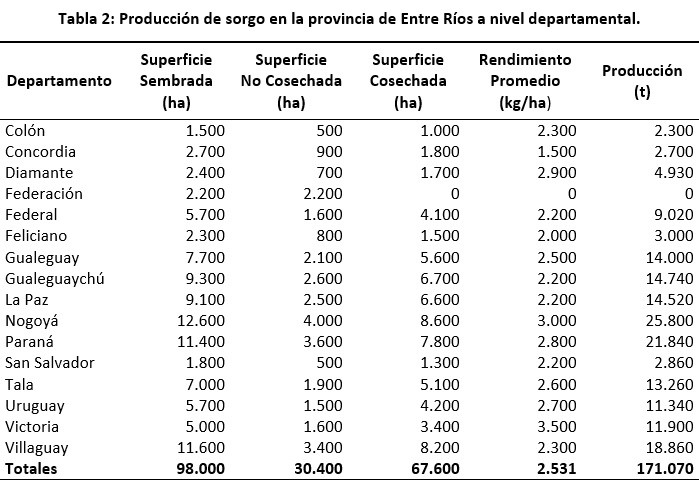 Los datos estadísticos sobre la superficie implantada con sorgo a nivel departamental se presentan en la Tabla 2.