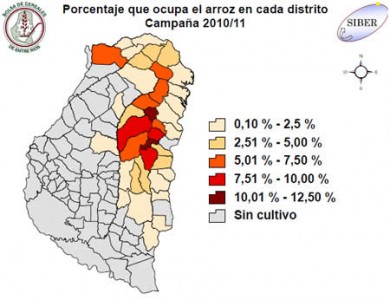 Los distritos que en proporción a su superficie han destinado más hectáreas a la producción de arroz son: Las Colonias y Walter Moss (Dpto. San Salvador), con un rango que supera el 10% hasta un máximo de 12,5%.
