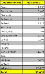 Los distritos que cuentan con mayor superficie con el cultivo son: Lucas Sur y Bergara (Dpto. Villaguay) y Tacuaras (Dpto. La Paz); los cuales poseen un área superior a las 8.000 ha e inferior a las 13.500 ha.