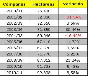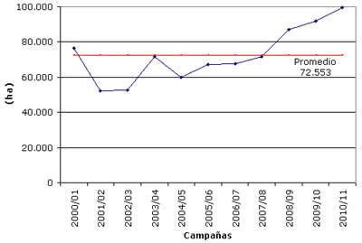 Durante el período en estudio, el cultivo tuvo una mínima expresión de 52.300 ha en la campaña 2001/02. Por otra parte, el promedio de los últimos once años se ubica en 72.553 ha; por lo tanto esta zafra supera en 27.055 ha dicho valor.