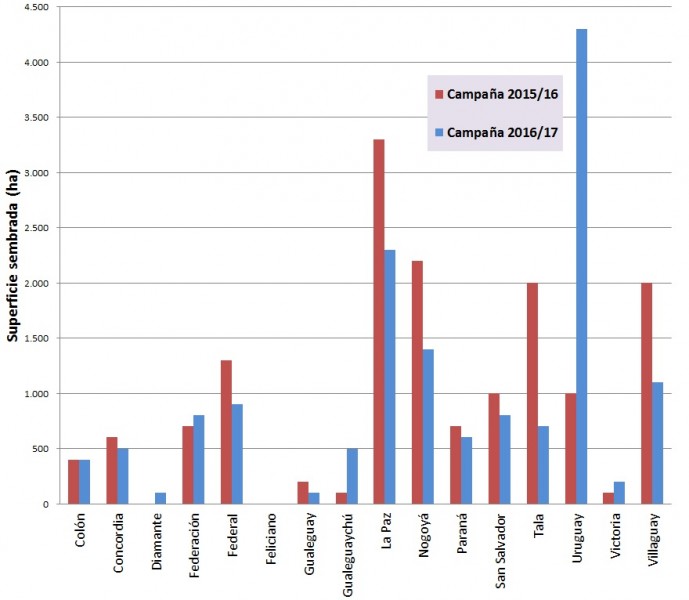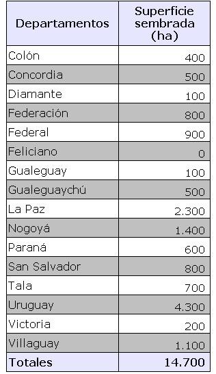 En la Tabla N° 2 se muestran los valores de superficie sembrada por departamento, se destaca en primer lugar Uruguay con 4.300 ha, en segundo nivel de importancia La Paz con 2.300 ha y tercero Nogoyá con 1.400 ha.
