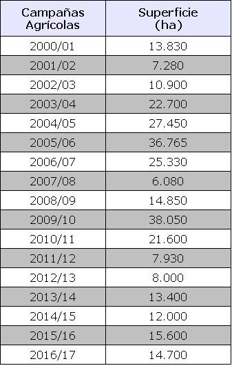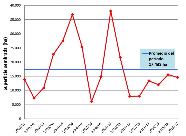El valor mínimo de superficie sembrada se registró en la campaña 2007/08 con 6.080 ha, mientras que el máximo fue de 380.050 hs en el ciclo 2009/10, con un promedio para el período analizado de 17.433 ha.