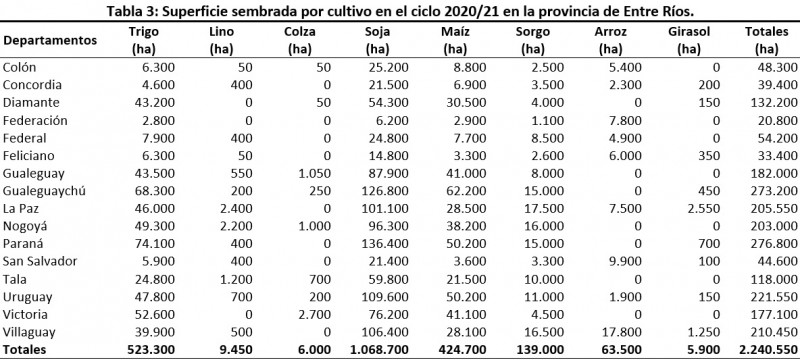 En la Tabla 3 se detalla la superficie sembrada de cada cultivo a nivel departamental en el ciclo 2020/21.