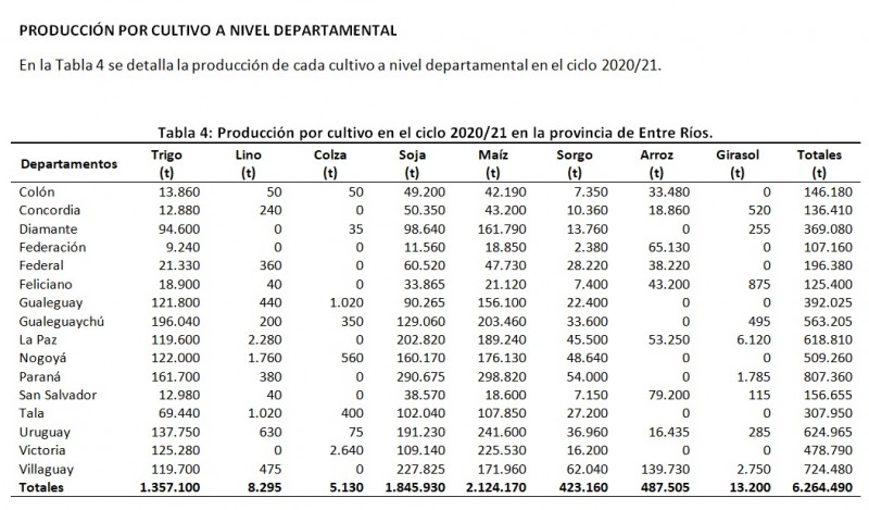 En la Tabla 4 se detalla la producción de cada cultivo a nivel departamental en el ciclo 2020/21.