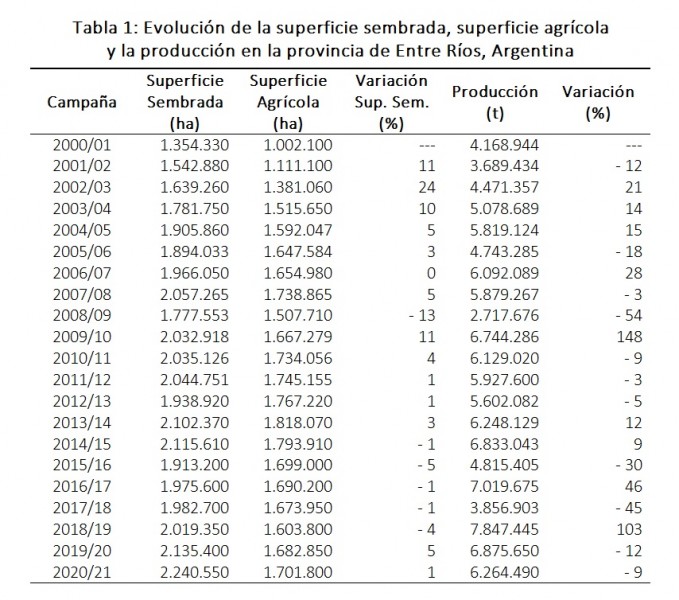 En la Tabla 1 se detalla la evolución de la producción agrícola en la provincia de Entre Ríos.