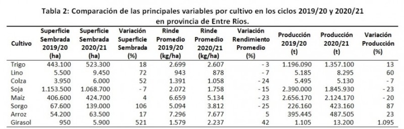 Este informe sintetiza la información de los principales cultivos: trigo, lino, colza, maíz, soja, sorgo, girasol y arroz implantados en la campaña 2020/21 en la provincia de Entre Ríos.