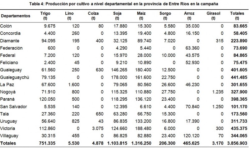 Los departamentos con mayor cantidad de hectáreas sembradas fueron: Paraná (254.600 ha) y Gualeguaychú (249.850 ha), cada uno abarcó el 13 % del total.