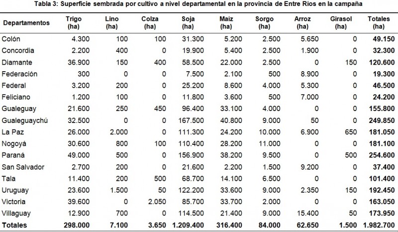 Los departamentos ubicados hacia el Noreste (Federación, Feliciano, Concordia, San Salvador, Federal y Colón) tuvieron la menor superficie sembrada y representaron entre el 1 al 2 % del área total (ver Tabla 3).