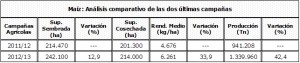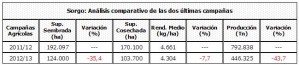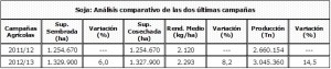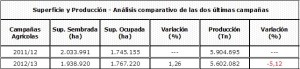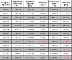 En ambos ítems se aprecia un crecimiento sostenido con excepción de la campaña 2008/09 relacionada con una inusual situación de sequía estival; los parámetros de la campaña 2012/13 no tienen significativa diferencia con el ciclo agrícola anterior.