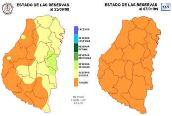 El mapa de la derecha presenta la condición de las reservas hídricas al 07/01/09; período definitorio de rendimiento en los granos gruesos. En ese momento los productores entrerrianos veían en sus campos los severos síntomas de estrés que presentaban los cultivos, ya que se había instalado desde el mes de noviembre, una situación de sequía absoluta.