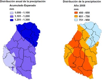 Por otra parte el mapa de la derecha presenta los montos totales de las lluvias y su distribución en el año 2008.