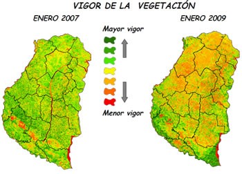 El mapa de la derecha presenta el índice de verdor del mes de enero del 2009, (Año NIÑA) que tuvo una media acumulada de 60 mm aproximadamente o sea 40% menos de los esperado y claramente se observa disminución en el vigor de la vegetación (mayor presencia de tonos rojos y naranjas), lo cual indica la presencia de grave estrés hídrico.