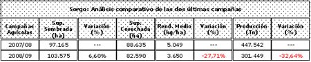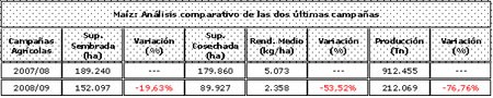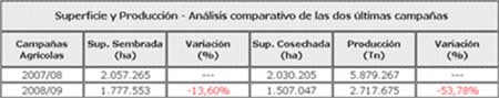 Los cultivos que mayor incidencia tuvieron en el disminuido tonelaje de producción fueron el maíz y la soja, las consecuencias de las CONDICIONES CLIMATICAS NO FAVORABLES fueron determinantes para la merma de 700.386 tn de maíz y 1.919.283 tn de soja, si se compara con la campaña 2007/08.