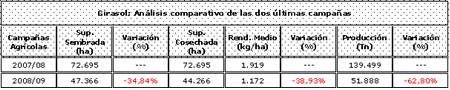 La provincia de Entre Ríos ha finalizado el ciclo agrícola 2008/09, una infortunada campaña signada por una extraordinaria sequía que tuvo su incidencia negativa en todos los cultivos de gruesa, fenómeno al cual no escaparon ni el girasol ni el arroz a pesar de ser uno tolerante a condiciones de poca humedad y un cultivo irrigado el otro.