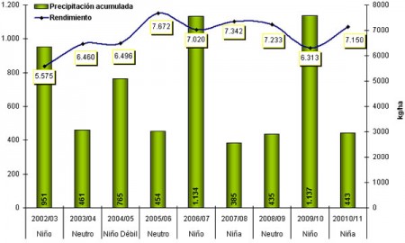Una excepción se presentó en la campaña 2006/07 en donde hubo un evento “Niño” en el verano y desde noviembre a marzo se contabilizó un total de 1.134 mm; pero durante el período crítico del cultivo (enero y febrero), en la ciudad de Villaguay los días con lluvias fueron 13 y su acumulado de 342 mm, con mínimos de 5 mm y máximos de 60 mm. Si bien claro está que en comparación con la campaña 2005/06 (año Neutro) y 2007/08 (año Niña) se evidenció una disminución en el rendimiento promedio, el mismo no fue tan marcado como sucedió en otras campañas signadas climaticamente por en evento Niño.