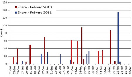 En Enero y Febrero del año 2010 que se correspondió con un evento “El Niño”, se contabilizó un total de 14 días con lluvias y un monto total de 578 mm, siendo el mínimo 4 mm y el máximo de 95 mm.