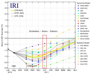 El Gráfico 2 refleja la salida de varios modelos climáticos, esta información fue publicada el 14 de setiembre del 2010 por la NOAA (National Oceanic and Atmospheric Administration) en sus reportes semanales.
