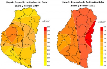 En los mapas claramente se observa que en enero y febrero del año 2011 los niveles de radiación fueron significativamente mayores a los del ciclo agrícola anterior, relacionándose estos valores con la reducción en el número de días con precipitaciones junto con la disminución de la nubosidad.