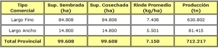 Por otra parte, al tipo largo ancho le correspondió el 14,86% restante con una superficie de 14.800 ha y una producción de 81.415 tn, que se corresponde con el 11,43% de lo producido y con un rendimiento promedio de 5.501 kg/ha.