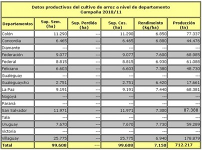 La implantación de arroz para la campaña 2010/11 inició a mediados del mes de setiembre en el norte del departamento La Paz, expresándose por parte de los productores una intención de siembra con tendencia alcista. Esta afirmación se basaba en el hecho de que las represas contaban con su máxima capacidad y por otra parte, la zona de riego por pozos exhibía una señal de ampliación del área existiendo en una fuerte demanda para pozos nuevos; la cual posteriormente se aquietó por la falta de incentivos que exhibía la cotización del arroz.