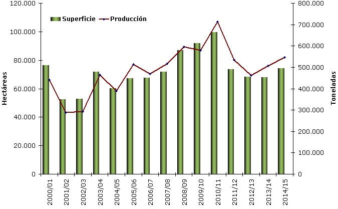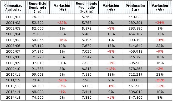 Dentro del período analizado se detectó un mínimo de 52.300 ha y 289.501 tn en el ciclo 2001/02 y un máximo de 99.608 ha y 712.217 tn en la campaña 2010/11, la zafra que acaba de finalizar superó en 2.057 ha la media de superficie y 59.956 tn al valor medio de producción.