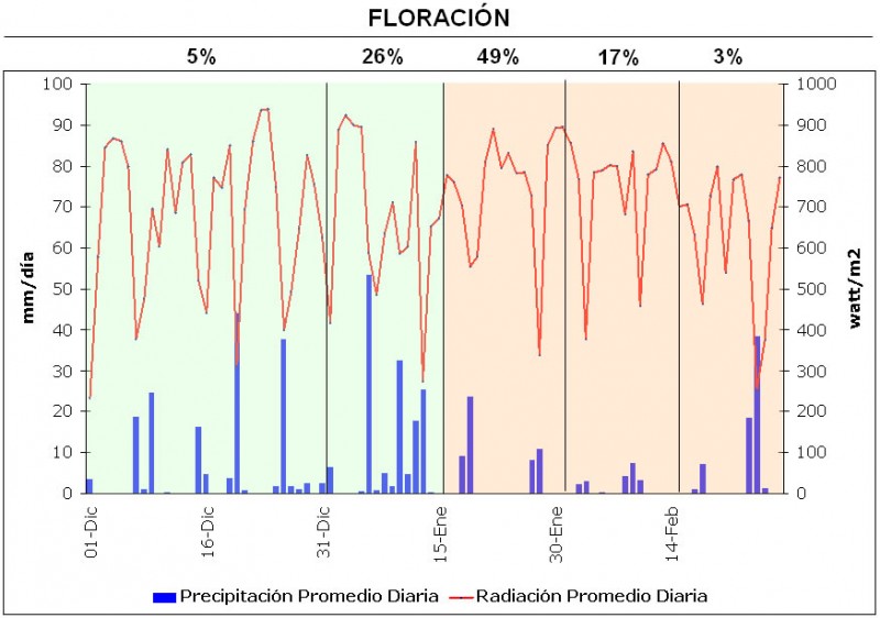 Las chacras que florecieron desde la segunda quince de enero a fines de febrero tuvieron un total de 31 días con precipitaciones y una radiación solar media de 708 watts/m2.