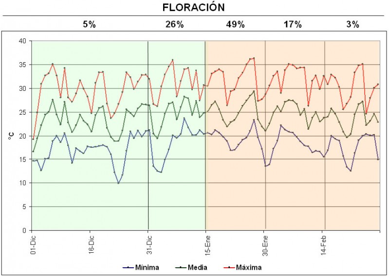 La marca mínima más baja del período se midió el 23 de diciembre, donde el valor promedio de la Red de Centrales Meteorológicas perteneciente a la Bolsa de Cereales de Entre Ríos fue de 10º C; aunque cabe mencionar que a esa fecha tan solo había florecido alrededor del 5% del área sembrada.