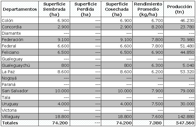 La Bolsa de Cereales de Entre Ríos a través de su Sistema de Información Agrícola da a conocer el reporte de producción de arroz correspondiente al ciclo agrícola 2014/15 en la provincia de Entre Ríos.
