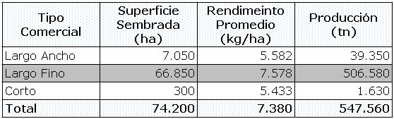 En lo que respecta a los tipos comerciales, se estimó que aproximadamente el 90,1% fue implantado con arroz largo fino, existiendo alrededor de 9,5% de grano arroz largo ancho y el 0,4% fue cultivado con tipo comercial corto, ver Tabla Nro. 3.
