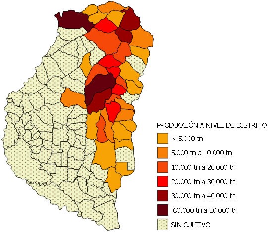 La mayor producción se encuentra en los distritos Lucas Sur (Dpto. Villaguay) y Tacuaras (Dpto. La Paz) con un total de toneladas que se ubica dentro del rango de 60.000 tn a 80.000 tn. Estos dos distritos abarcaron una producción de 143.000 tn, lo cual representó el 26% en relación al total.