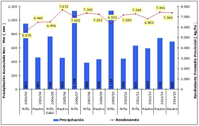 Considerando las últimas 13 campañas se observa que el rendimiento promedio provincial de los años donde el Pacífico Ecuatorial estuvo en estado de “Neutralidad” es de 7.165 kg/ha, lo cual es afín a lo registrado en el ciclo 2014/15.