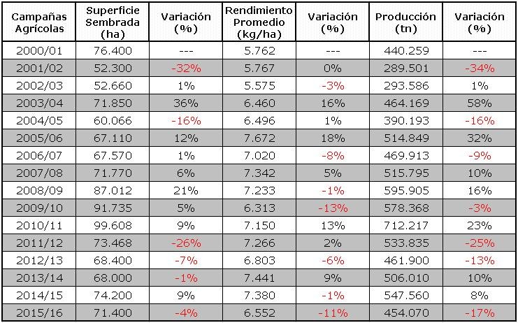 Menor rendimiento promedio provincial que se situó en 6.552 kg/ha, verificándose una caída del 11% (828 kg/ha) con respecto a 7.380 kg/ha obtenidos en la campaña 2014/15.