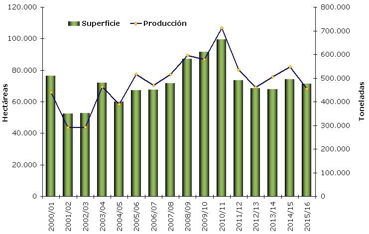 Por otra parte, en este mismo período la producción ha presentado una mayor variación con un valor mínimo de 454.070 tn y un máximo de 547.560 tn, siendo el valor medio de 500.675 tn.