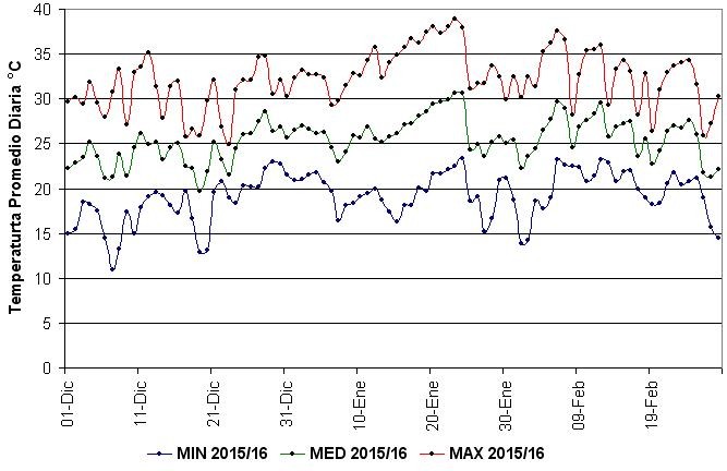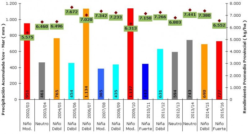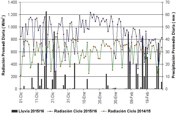 No obstante y apesar de que el ciclo 2015/16 estuvo marcado por un calentamiento del Pacífico Ecuatorial (evento conocido como “El Niño») y aunque las precipitación promedio acumulada entre noviembre y marzo fue de 727 mm (superando al monto esperado que es de aproximadamente 600 mm); no se midió un efecto negativo en los niveles de radiación durante la floración (trimestre diciembre – febrero).