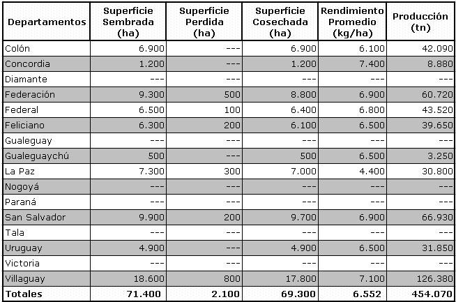 El distrito Lucas al Sur (Dpto. Villaguay) se ubicó como el de mayor importancia, alcanzando una producción ubicada dentro del rango de 60.000 tn y 65.000 tn.