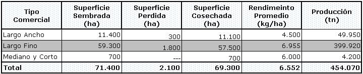 Para el caso del tipo comercial largo ancho tuvo un área cultivada de 11.400 ha (equivalente al 16%), con un rendimiento promedio de 4.500 kg/ha y un total de 49.950 tn (11% con respecto al total).