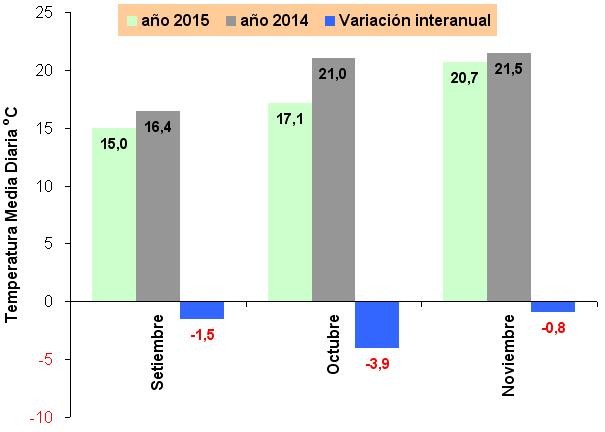 En el Gráfico Nro. 2 se muestra la temperatura promedio diaria para los meses de setiembre, octubre y noviembre comparando lo acontecido en el 2015 versus los registros estadísticos del Servicio Meteorológico Nacional.