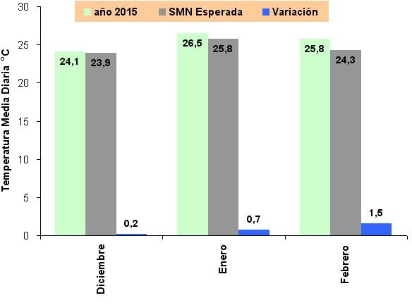 El comportamiento de las marcas térmicas del trimestre diciembre – febrero estuvo dentro de los registros publicados por el Servicio Meteorológico Nacional, a excepción de febrero que tuvo un desvío positivo de 1,5 oC.