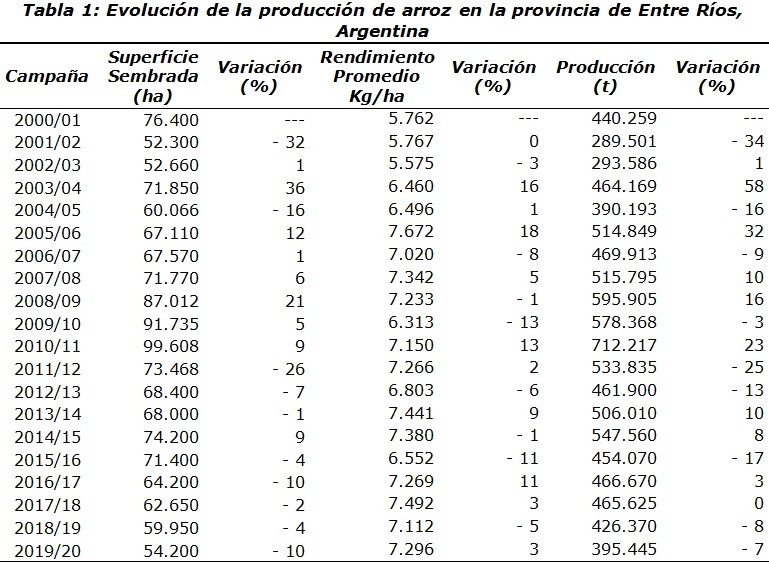 En la Tabla 1 se detalla la evolución de la producción de arroz en la provincia de Entre Ríos.