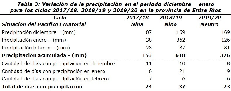 Es importante destacar que en los tres últimos años en el trimestre diciembre – enero – febrero el Pacífico Ecuatorial presentó un enfriamiento (evento denominado “La Niña”), un calentamiento (evento denominado “El Niño”) y temperaturas dentro del promedio histórico (estado de neutralidad).