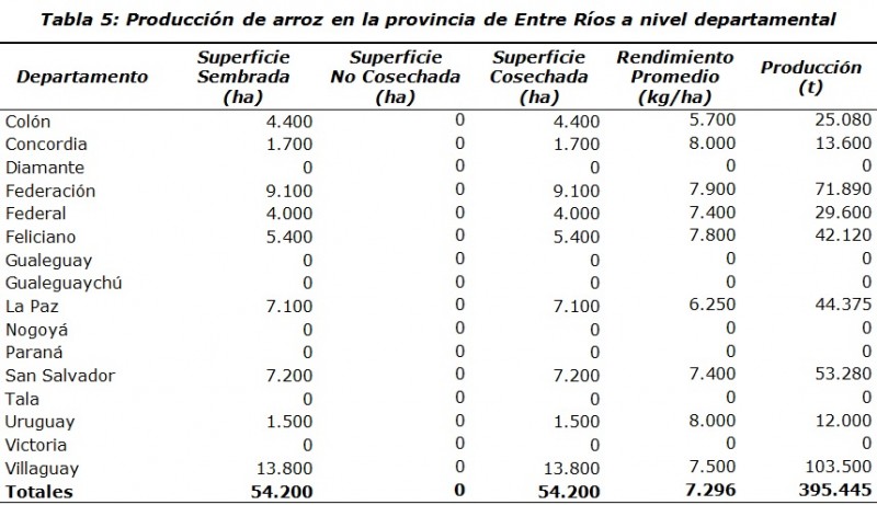 Los datos estadísticos sobre la superficie implantada con arroz a nivel departamental se presentan en la Tabla 5.