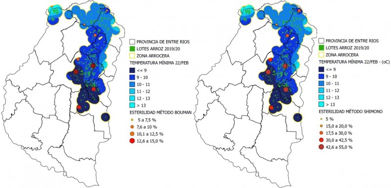 Para los lotes que se encontraban en el período de 20 días antes hasta 10 días posteriores a la floración, por el modelo de Bouman et al., se puede estimar una esterilidad máxima del 12 al 15 %. No obstante, para los lotes que se encontraban específicamente con la panoja embuchada (máxima sensibilidad), en base al modelo de Shimono et al., la esterilidad se estima entre 42 a 55 %.