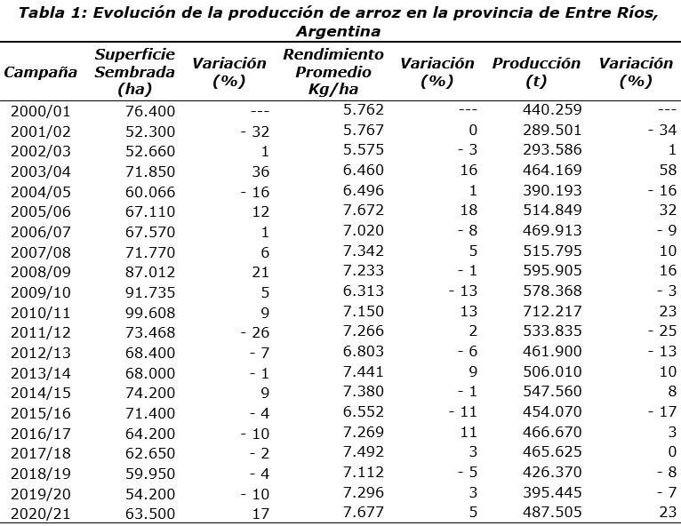 En la Tabla 1 se detalla la evolución de la producción de arroz en la provincia de Entre Ríos.