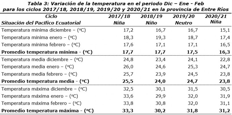 En la Tabla 3 se presenta el promedio de la temperatura mínima, media y máxima para las cuatro últimas campañas.