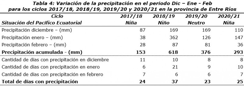 En la Tabla 4 se presenta la precipitación promedio mensual y acumulada para el trimestre en estudio de los últimos cuatro años. Las características más relevantes del ciclo 2020/21 son las siguientes:
