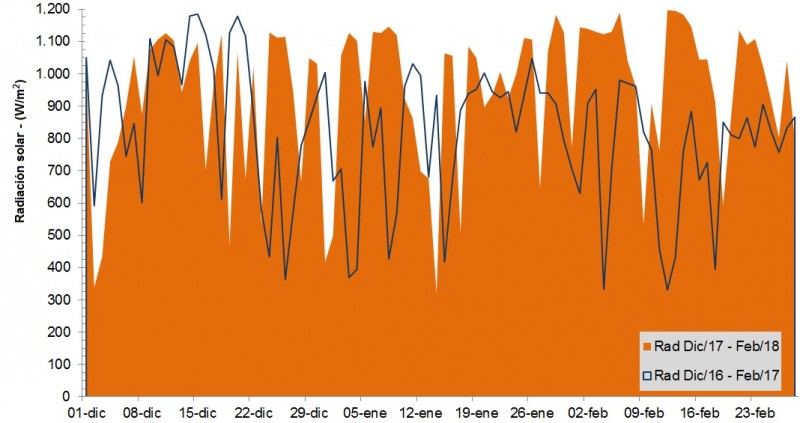 El promedio diario de la radiación en el trimestre diciembre – febrero para la campaña 2017/18 fue de 944 w/m2, con respecto al ciclo anterior se detectó un incremento del 15 % (el promedio diario durante el ciclo 2016/17 fue de 821 w/m2).