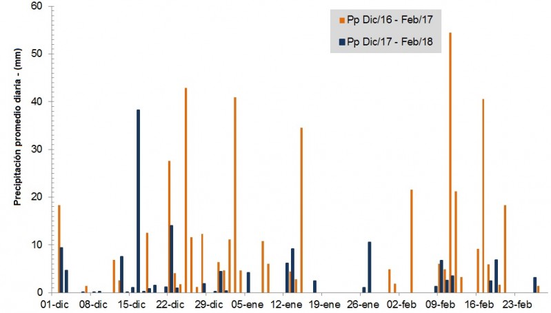 En el ciclo 2017/18 el trimestre diciembre – febrero la precipitación promedio en Entre Ríos fue de 148 mm, mientras que en el ciclo 2016/17 el valor se ubicó en 465 mm, lo cual marca una disminución del 215 %, es decir 317 mm.