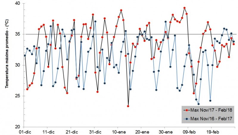 Entre el 1/12/17 al 28/02/18 hubo un total de 33 días donde la temperatura máxima superó el umbral de 35 oC, mientras que en el ciclo 2016/17 la cantidad de días fue de 11 días.