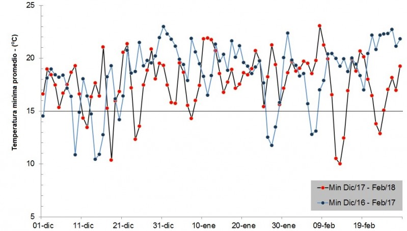 El promedio de la temperatura mínima del trimestre diciembre – febrero en el ciclo 2017/18 se ubicó 17,7 oC y se registró una disminución de 0,9 oC en relación a la campaña anterior, donde el valor promedio fue de 18,5 oC.