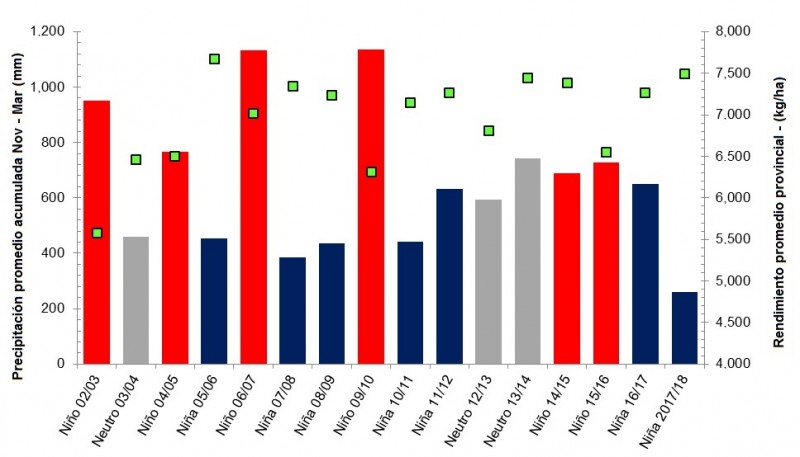 El promedio de la precipitación esperada para la provincia de Entre Ríos desde noviembre a marzo se sitúa alrededor de los 600 mm, el ciclo 2017/18 tuvo un promedio de tan solo 260 mm, es decir que experimentó una caída del 57 % (340 mm).